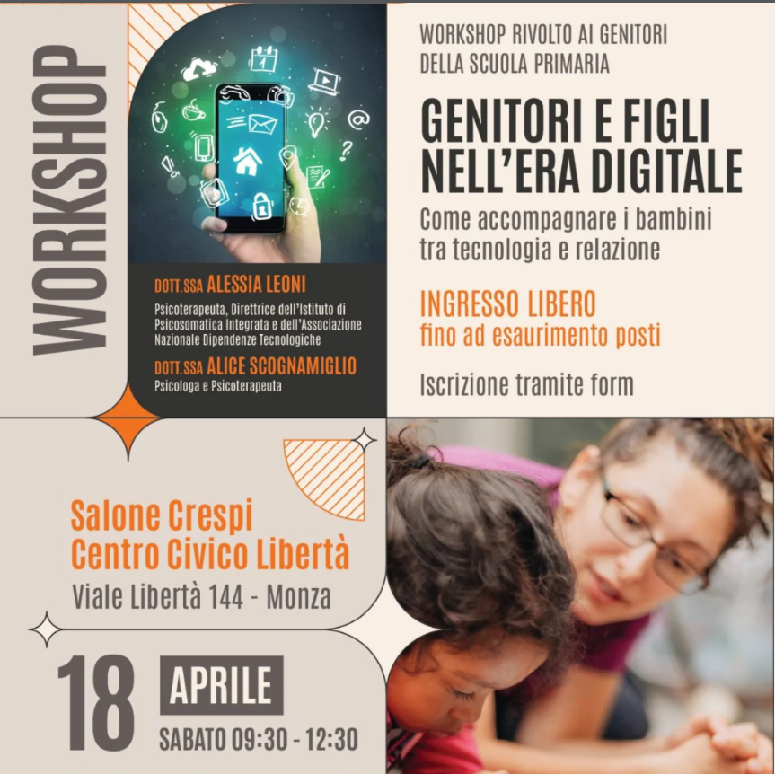 Sabato 18 aprile presso il Liberthub di Monza si terrà il primo workshop dell’Associazione Genitori IC Via Raiberti dedicato al mondo del digitale e dell’influenza sulle relazioni genitori-figli. Ingresso gratuito previa iscrizione online e sino ad esaurimento posti
